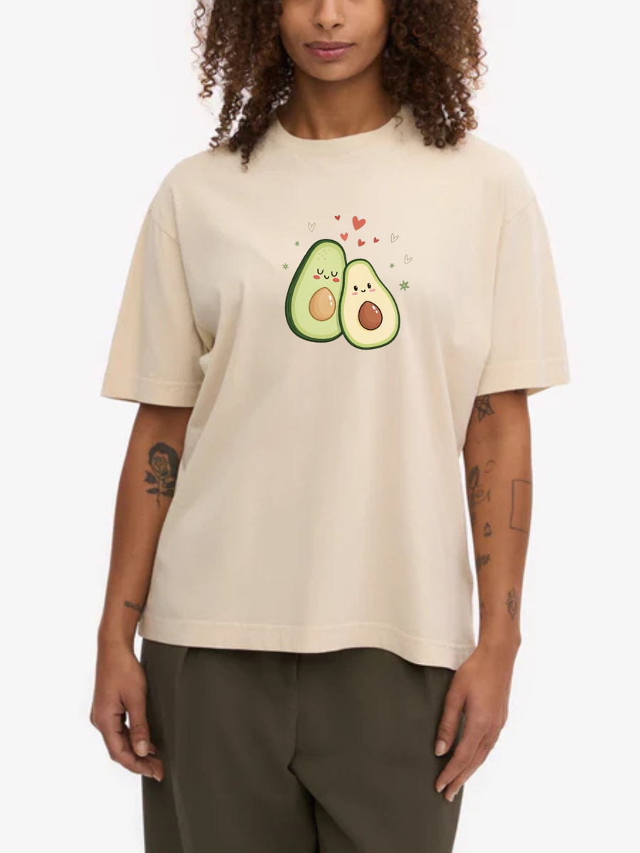Designed for everyday comfort with a playful twist, this soft cotton tee features an adorable avocado couple print at the front, symbolizing love and togetherness. A fun yet versatile piece, it’s ideal for gifting, lounging, or styling up for casual outings.