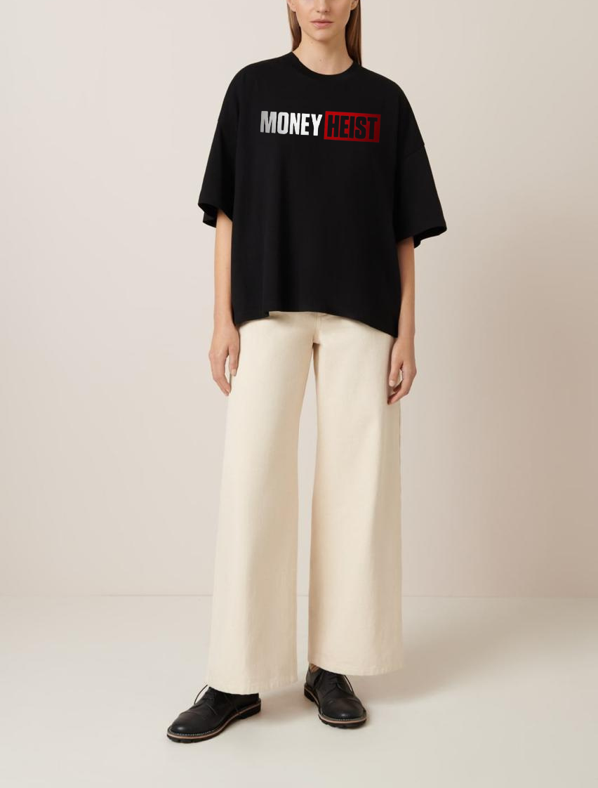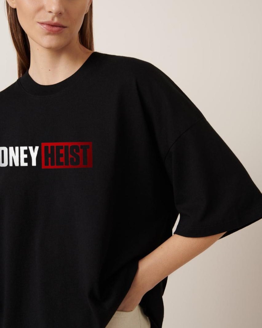 Featuring the bold “MONEY HEIST” text graphic in striking silver and red on the front, this t-shirt is a must-have for fans and fashion lovers alike. Pair it with jeans, joggers, or shorts for a casual yet statement look.