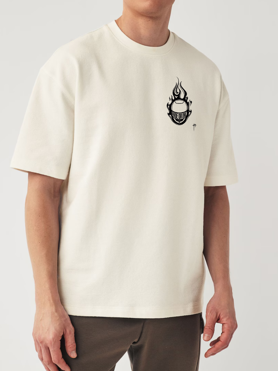 This beige oversized t-shirt is made for those who live for the rush of the ride. The back features a large, dynamic graphic of a mountain biker racing downhill in a vibrant green and dark blue color palette. Below the rider, the bold phrase “DOWNHILL IS MY THRILL” is printed in matching green and blue, capturing the spirit of extreme sports. The front of the shirt has a smaller, subtle graphic on the chest.